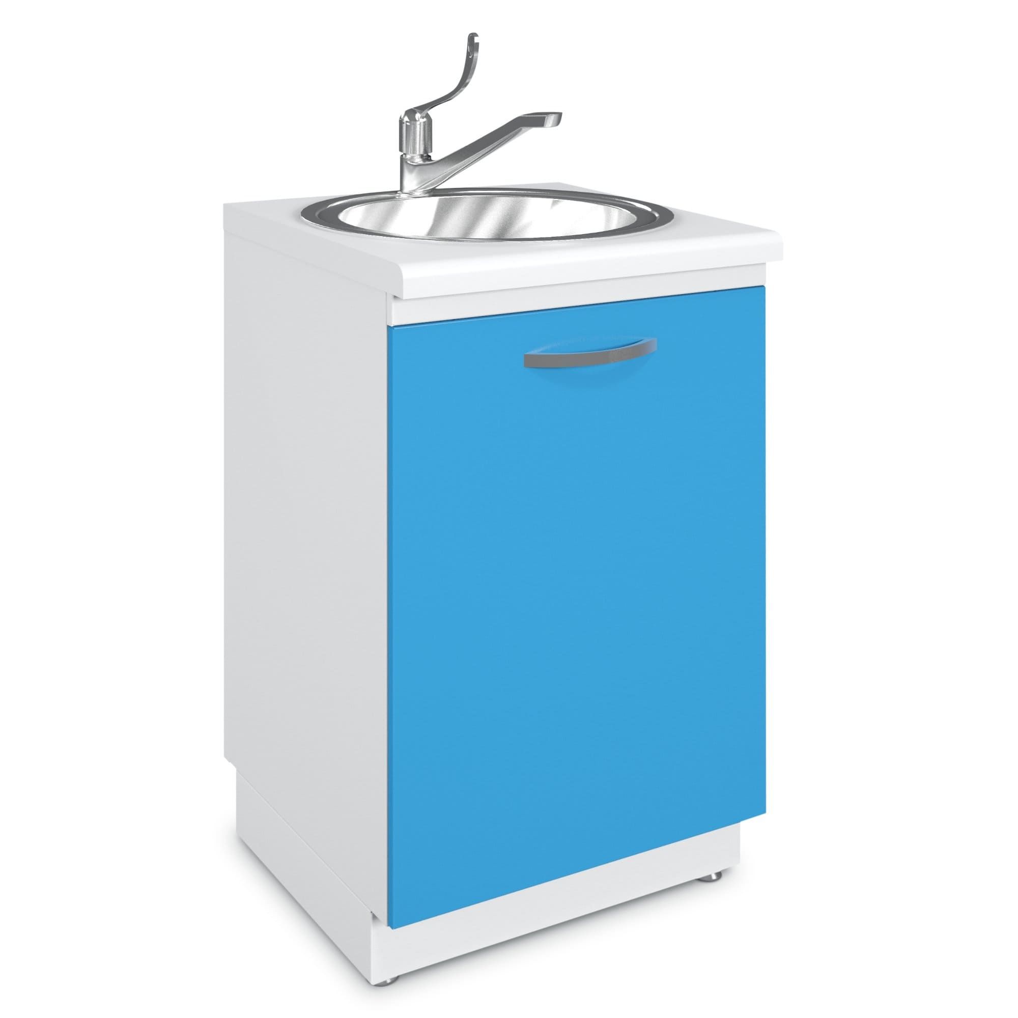 - В комплекте с тумбой может быть поставлена мойка из нержавеющей стали, диаметром 430 мм, локтевой смеситель и сифон