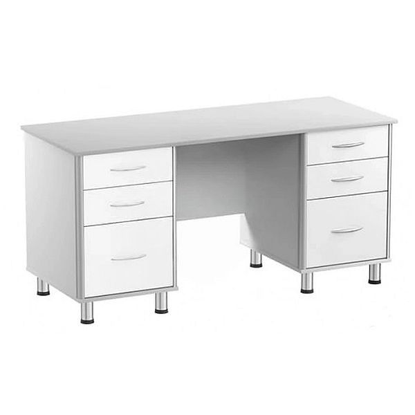 - Стол имеет 2 тумбы, каждая с 3-мя выдвижными ящиками на роликовых направляющих, выдерживающих нагрузку до 5 кг, размеры тумбы — 400x560 мм