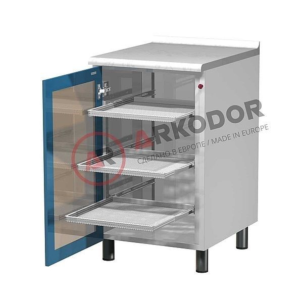 Шкаф с бактерицидной лампой и распашной застекленной дверью, тремя выдвижными металлическими полками.