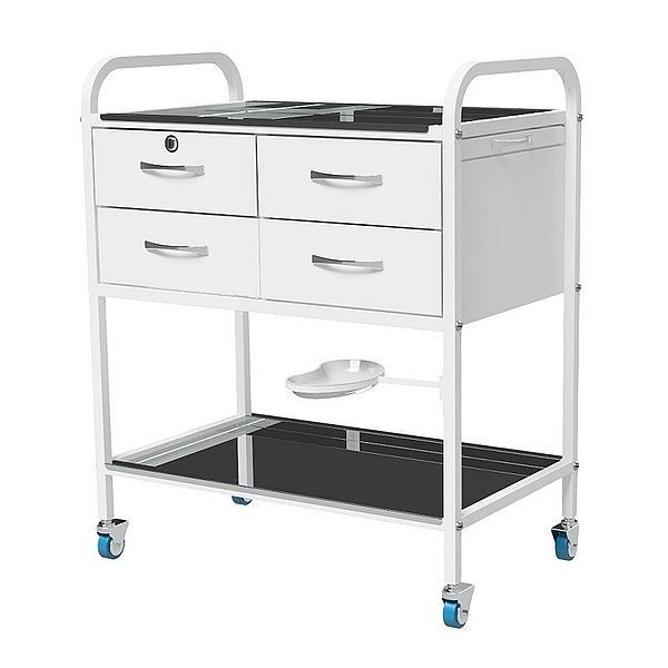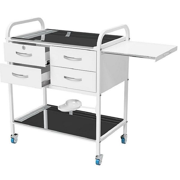 Ящики установлены на телескопические шариковые направляющие. На левой боковой стенке крепится ручка рейлинг (хром); два двойных крючка (хром). С обратной стороны полка, выдвигающаяся из под столешницы , один ящик с замком. Почкообразный лоток из нержавеющей стали, на поворотном кронштейне.