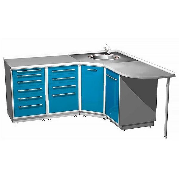 - Металлическая тумба угловая с распашной металлической дверью, с мойкой и смесителем.