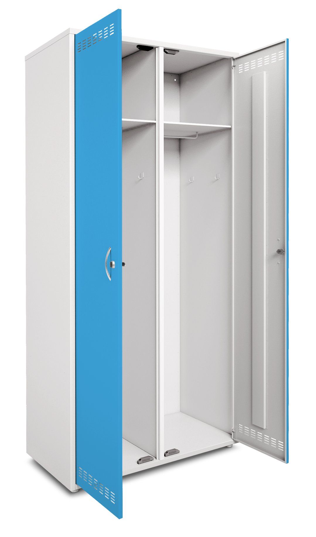- В верхней и нижней частях двери расположены вентиляционные отверстия, обеспечивающие циркуляцию воздуха внутри шкафа. В верхней части секции расположена стационарная полка для головных уборов. Отделение оснащено штангой для вешалок и крючками для одежды