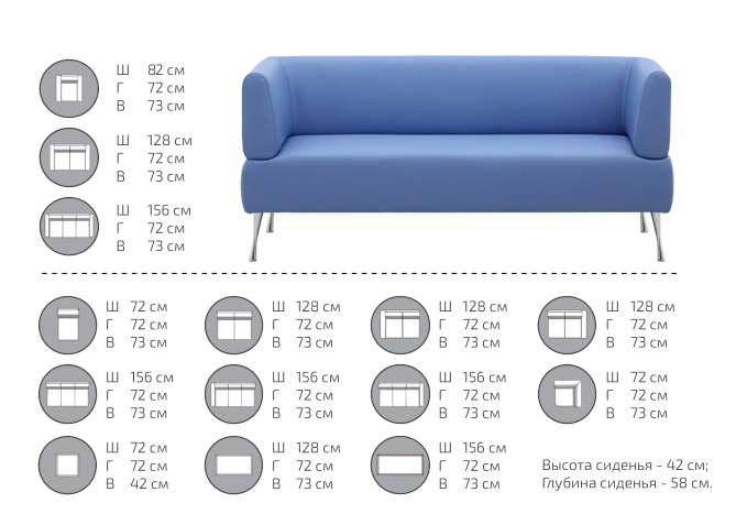 Варианты исполнения: кресло, диван 2-х местный, диван 3-х местный, угловой диван, модульные элементы без подлокотников, а также внешний и внутренний угол для создания конфигурации любой длины.