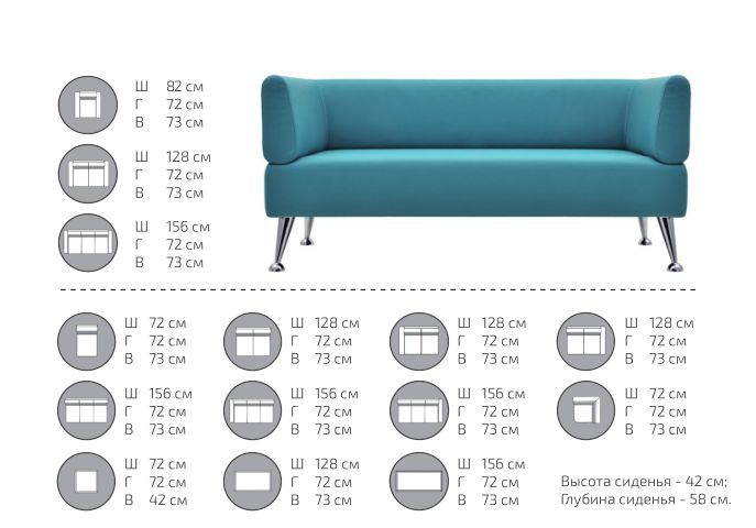 Варианты исполнения: кресло, диван 2-х местный, диван 3-х местный, угловой диван, модульные элементы без подлокотников, а также внешний и внутренний угол для создания конфигурации любой длины.